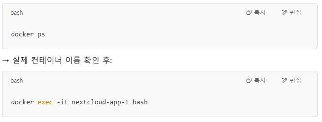 - 컨테이너 이름이 nextcloud가 아니라 nextcloud-app-1